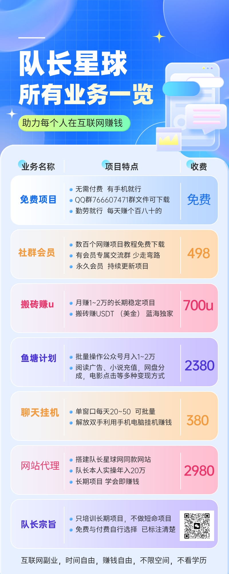 每个项目都有相对应的详细介绍吗,有需要了解的加队长微信senjia7788或qq 330999534咨询全年省钱机会只有一次,想在互联网上挣出一份事业的老铁们欢迎联系队长!